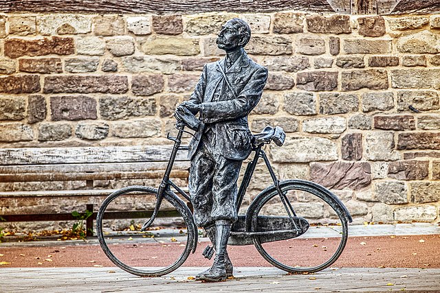 He enjoyed cycling, people may know that, cycled all over the local area, and there is a statue of him with his bicycle in Hereford, outside the cathedral. He played billiards; he tried various trades to make ends meet and didn't take himself too seriously. He drew cartoons, often caricaturing himself on his bicycle.